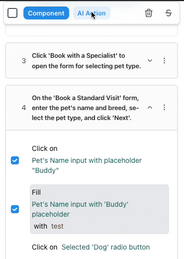 AI actions enhance your testing workflows by solving complex scenarios. Here are five concrete examples of how they’re used:- Test Data Reset - Reset application data to a specific state at the beginning of tests with commands like “Clear all user data” or “Reset inventory to default values.”